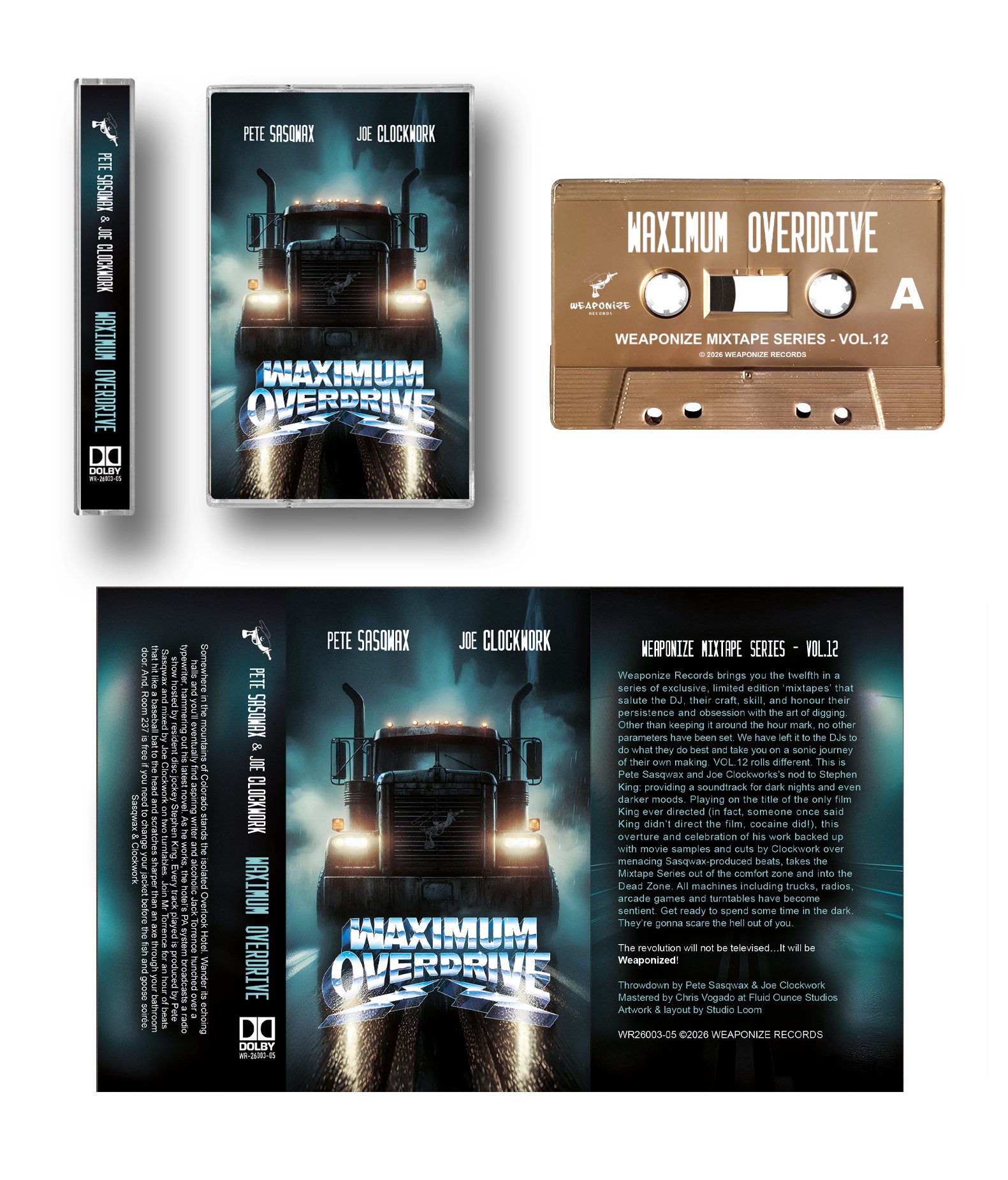 Weaponize Records brings you the twelfth in a series of exclusive, limited edition ‘mixtapes’ that salute the DJ, their craft, skill, and honour their persistence and obsession with the art of digging. Other than keeping it around the hour mark, no other parameters have been set. We have left it to the DJs to do what they do best and take you on a sonic journey of their own making.VOL.12 rolls different. This is Pete Sasqwax and Joe Clockwork's nod to Stephen King: providing a soundtrack for dark nights and even darker moods. Playing on the title of the only film King ever directed (in fact, someone once said King didn't direct the film, cocaine did!), this overture and celebration of his work backed up with movie samples and cuts by Clockwork over menacing Sasqwax produced beats, takes the Mixtape Series out of the comfort zone and into the Dead Zone. All machines including trucks, radios, arcade games and turntables have become sentient. Get ready to spend some time in the dark. They're gonna scare the hell out of you.